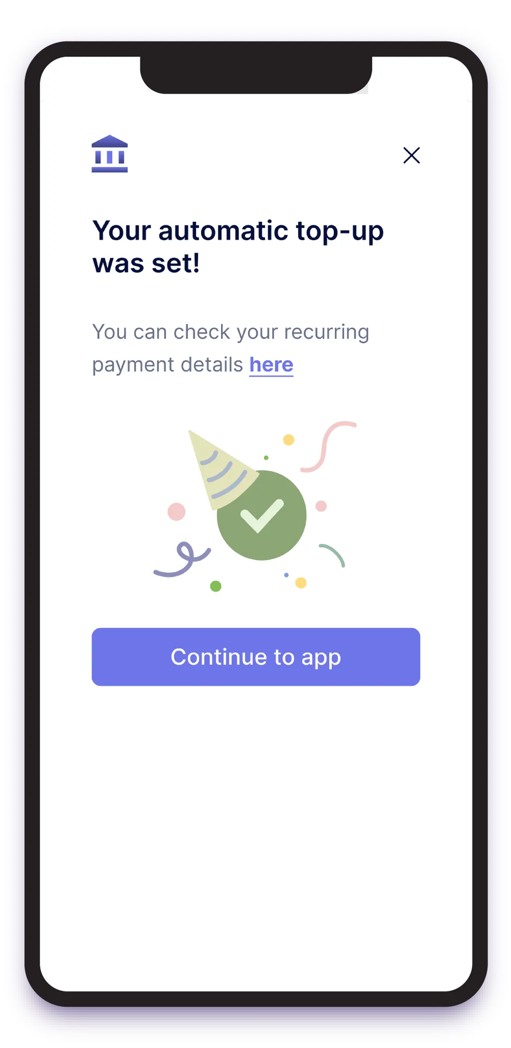 User sets the parameters of their automatic top-ups in the app, selecting values such as the maximum amount and monthly maximum transfer.